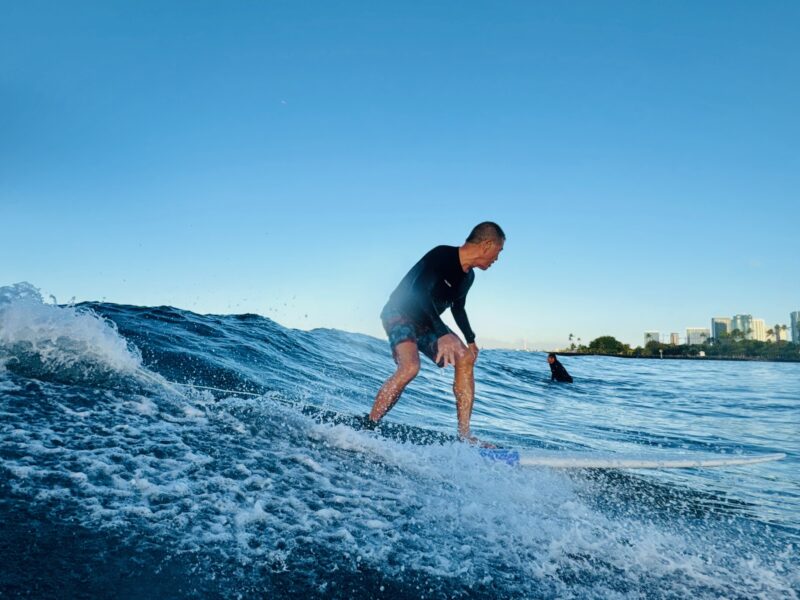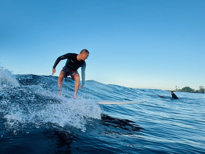 A good day for a 7’6 mid-length and a 1mm by Dove.