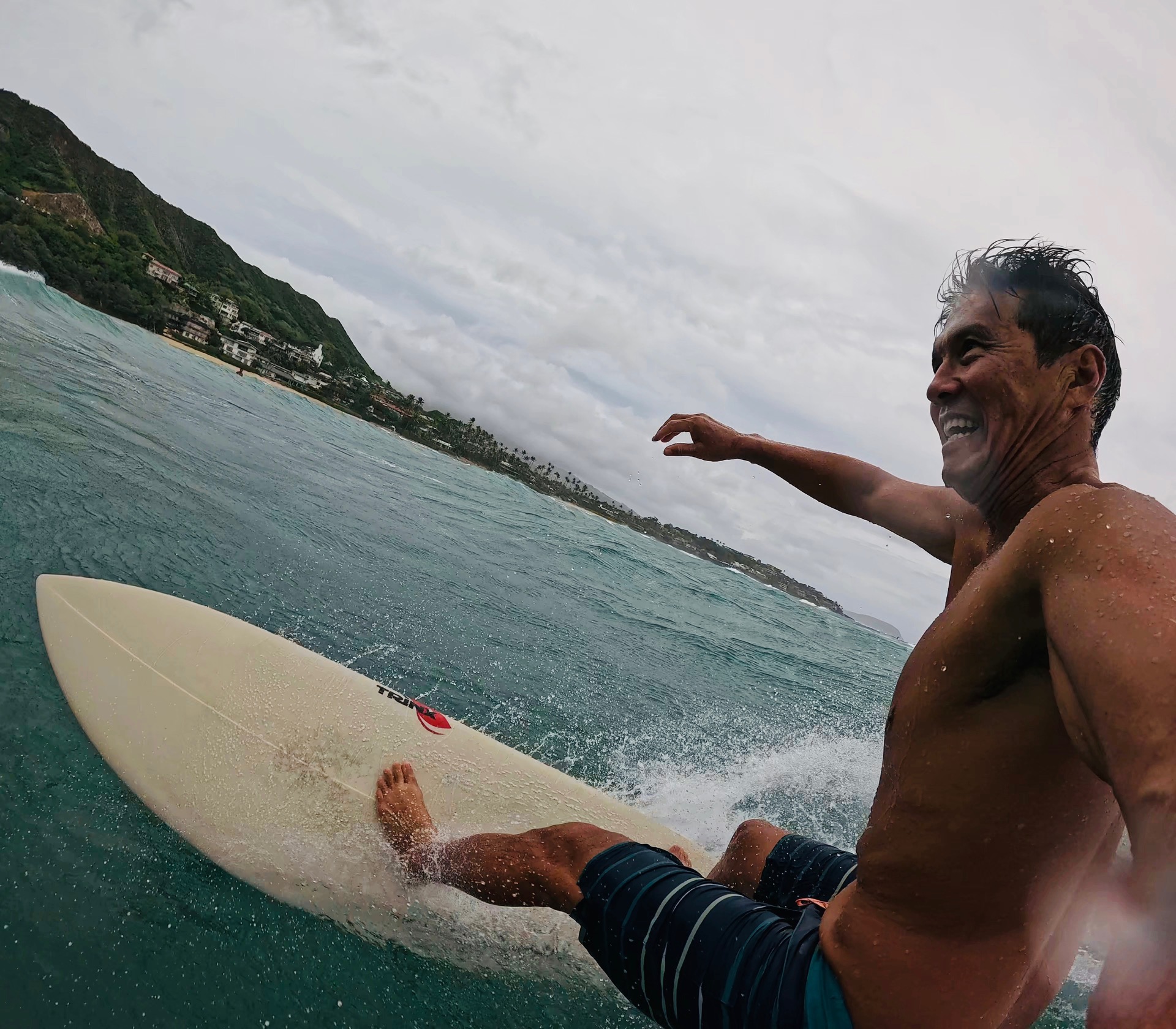 今年2回目のゴールデンサンライズに向かってサーフィンしているデコさん。太陽さんがまた戻ってきて凄く嬉しいよ!