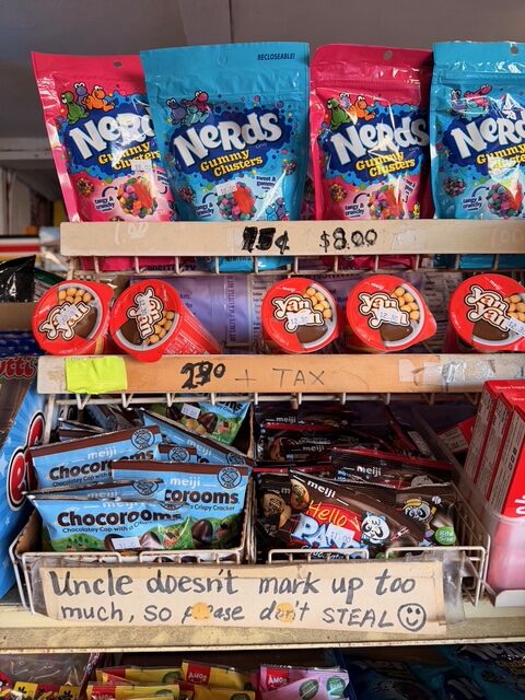 「アンクルはあまり値上げしないから、どうか盗まないで。」っていう看板がある。アンクルがこんな看板を作らないといけないなんて凄く悲しいよね。どうか万引きをしないで下さい。もししたら、価格がさらに上がっちゃうからね。