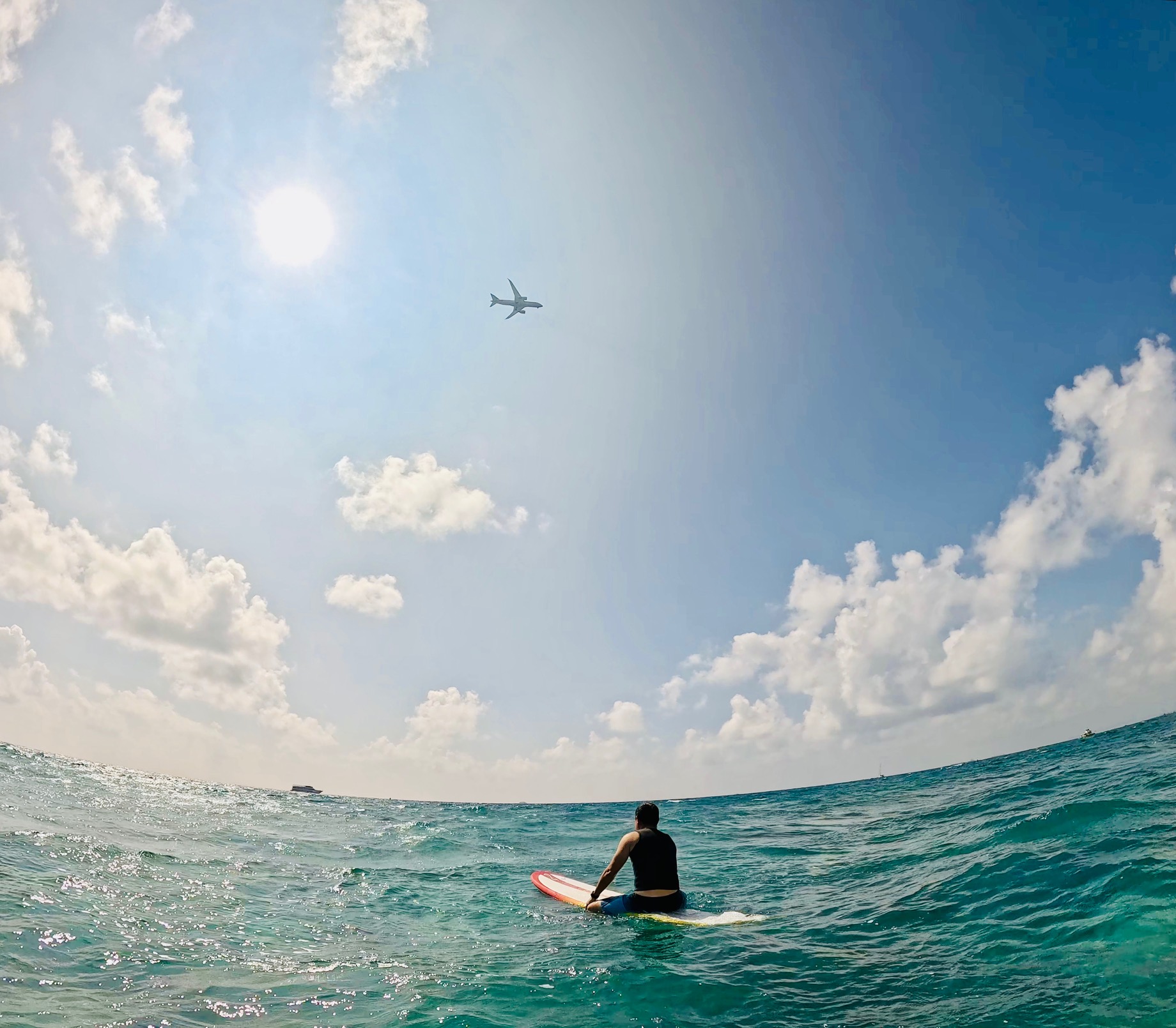 Boat, airplane, sun, and surfer…