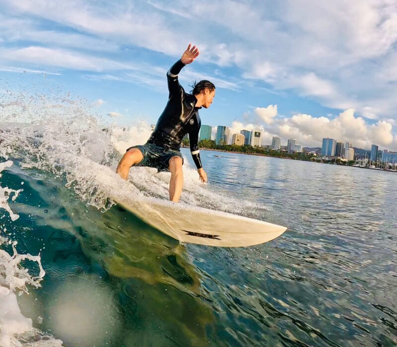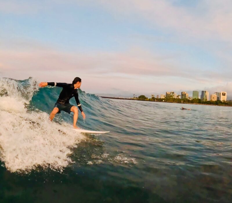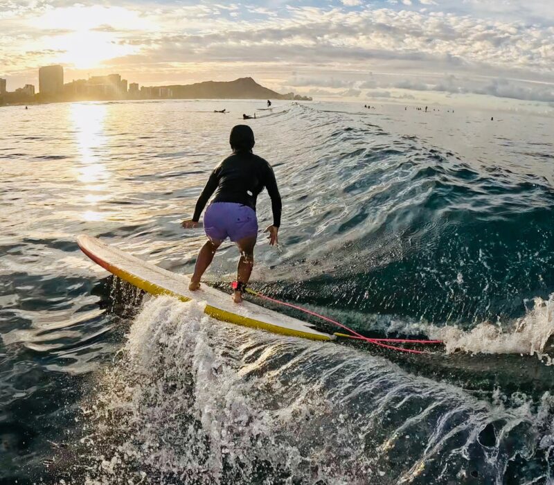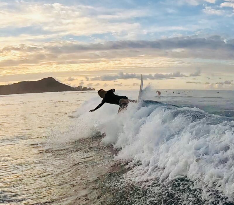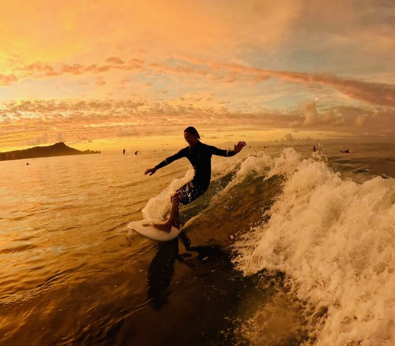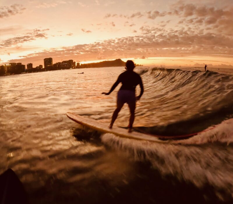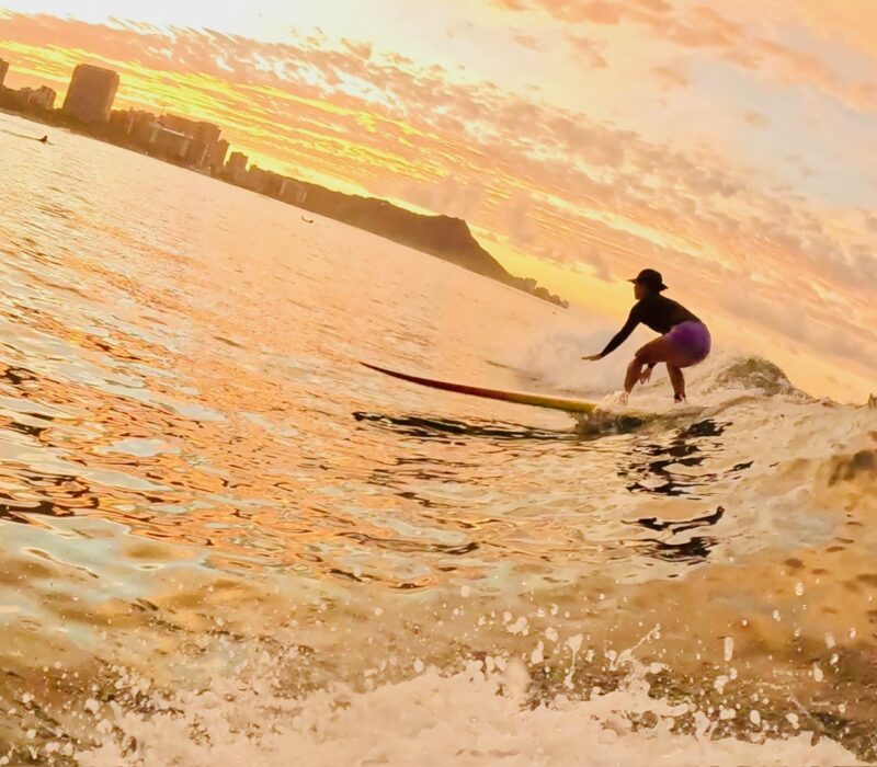 Kotaki-san surfing into the golden sunlight.