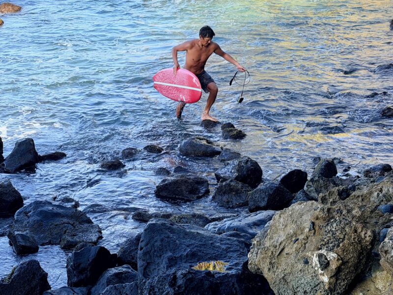 Very slippery, lots of sea urchin, and very easy to cut your feet. And if you slip and fall, you cut a lot more than your feet. I’ve been surfing here for over 40 years and I still bleed once in a while. This is called “The Rockdance!”