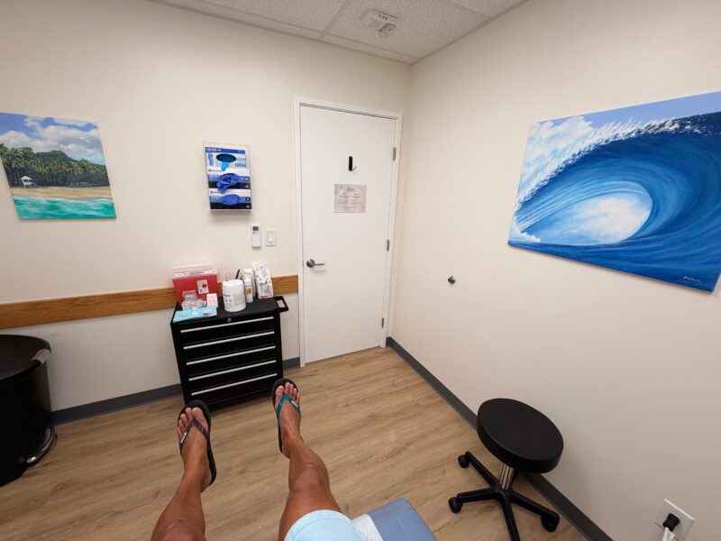 At my age and because of the time I spend in the sun, I’m supposed to get a skin cancer check every year. It’s been 3 years so I was a bit nervous. But being nervous in a doctors office like this is hard when you’re looking at that beautiful blue barrel. Skin cancer is the last thing on my mind because all I’m thinking about is getting barreled!