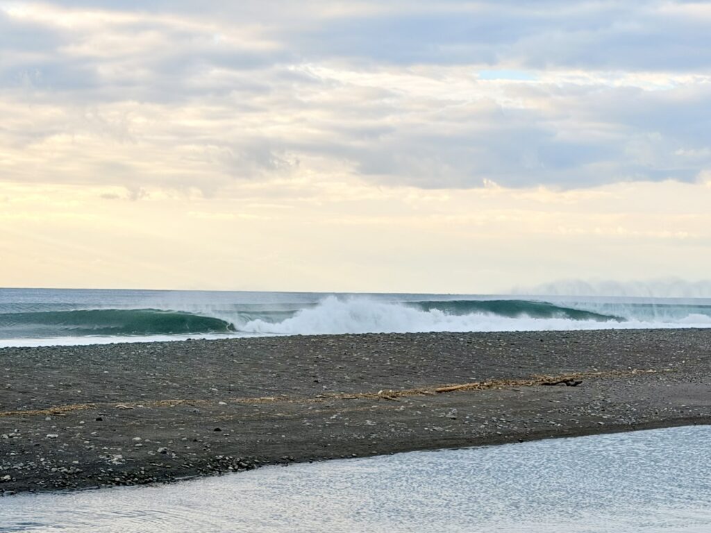 Good morning. OMG!!! Typhoon swell arrived. We are so lucky!!! Sightseeing trip just became a surf trip!!! Perfect barreling rights and nobody out. Looks like empty J-Bay. Freezing cold but we surfers surf!