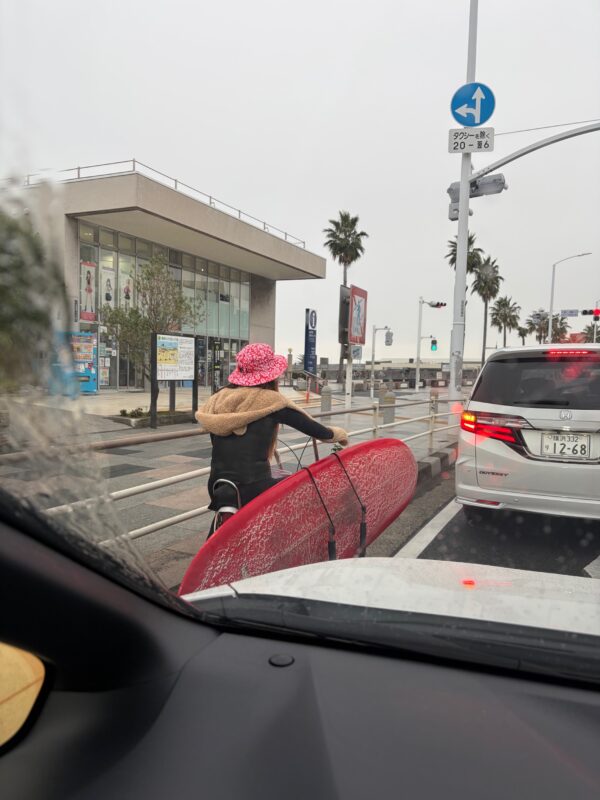 Japan was super cold and so was the water. When it rained, it was even colder than cold. BUT, if you’re a Japanese surfer, you surf no matter what. Surfing in a full wetsuit in the cold weather is hard core. And riding a bike to and from the beach? OMG, I respect these types of surfers so much. I tried this type of surfing twice in Japan and I thought I was going to die twice. Lots of respect for all you Japanese winter surfers!