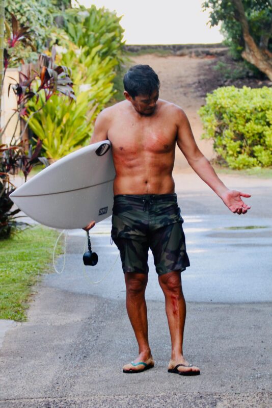 I protected my surfboard more than my body. I was just a natural instinct. My surfboard was ok but my whole body was scratched up from my chest to my toes. It looked like I got into a fight with a cat. Haha. I was planning to surf Backdoor right after this but thought I’d had enough damage for the day.