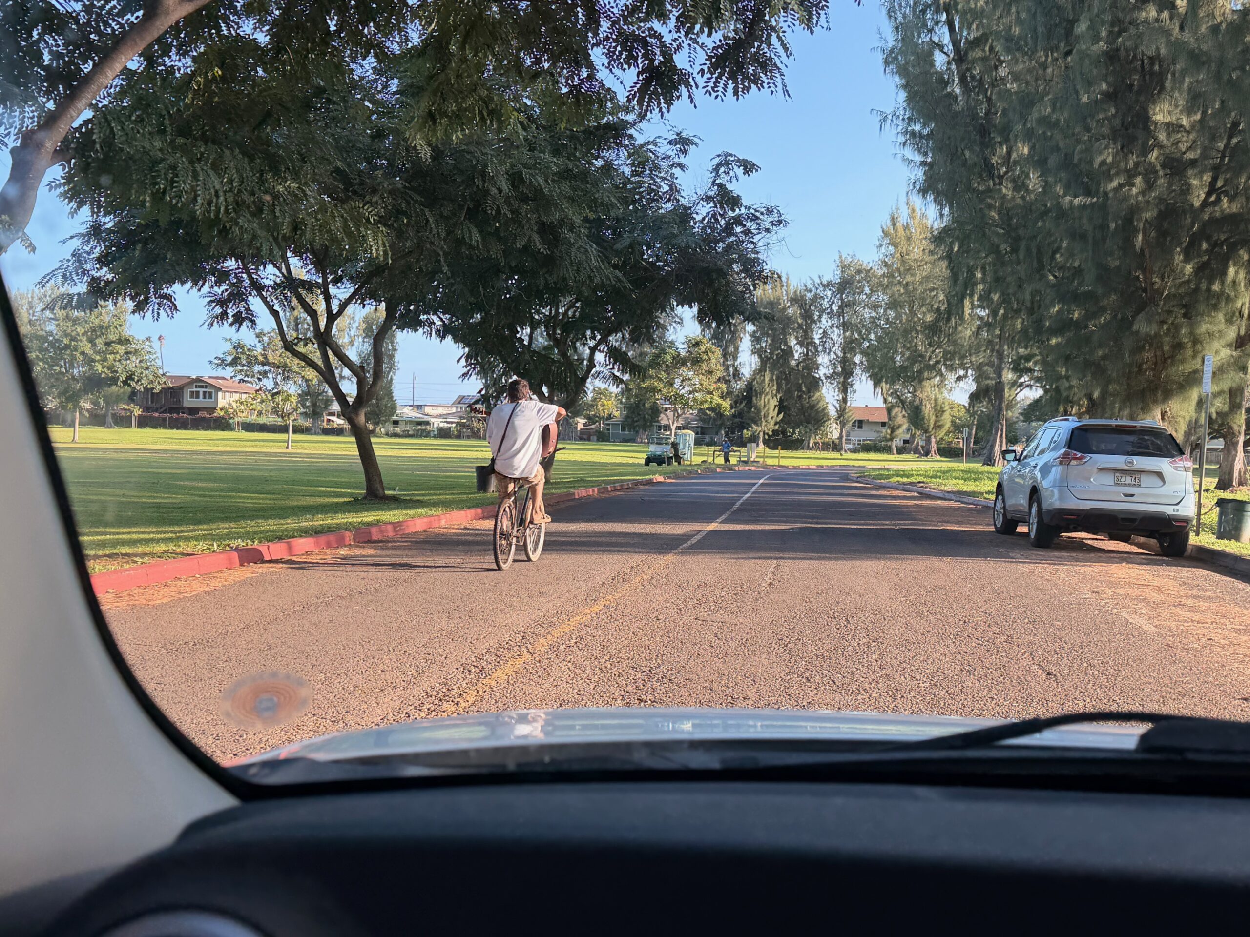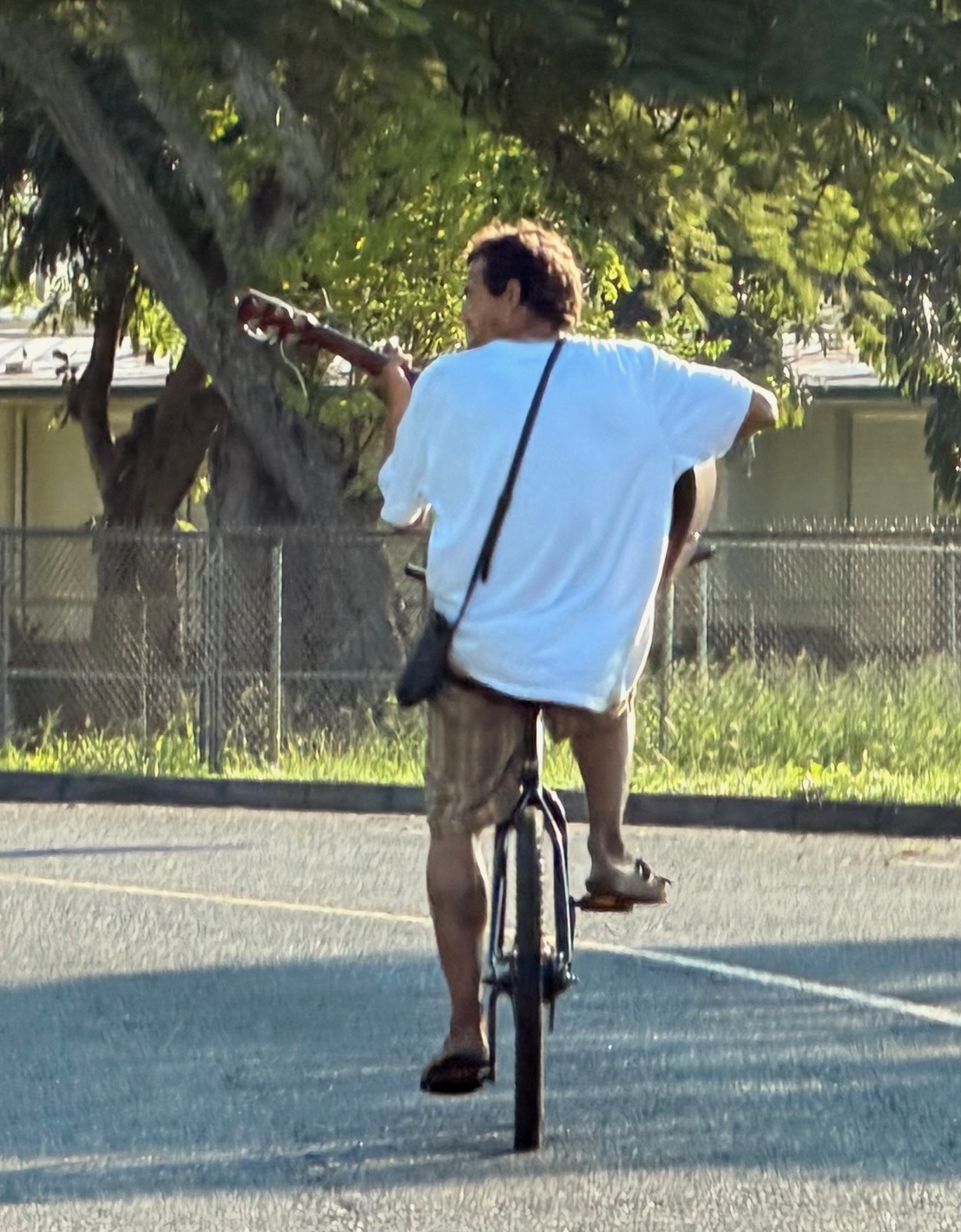 In Hawaii, you can see the coolest things. I was driving through a park and saw a guy singing on his bicycle.