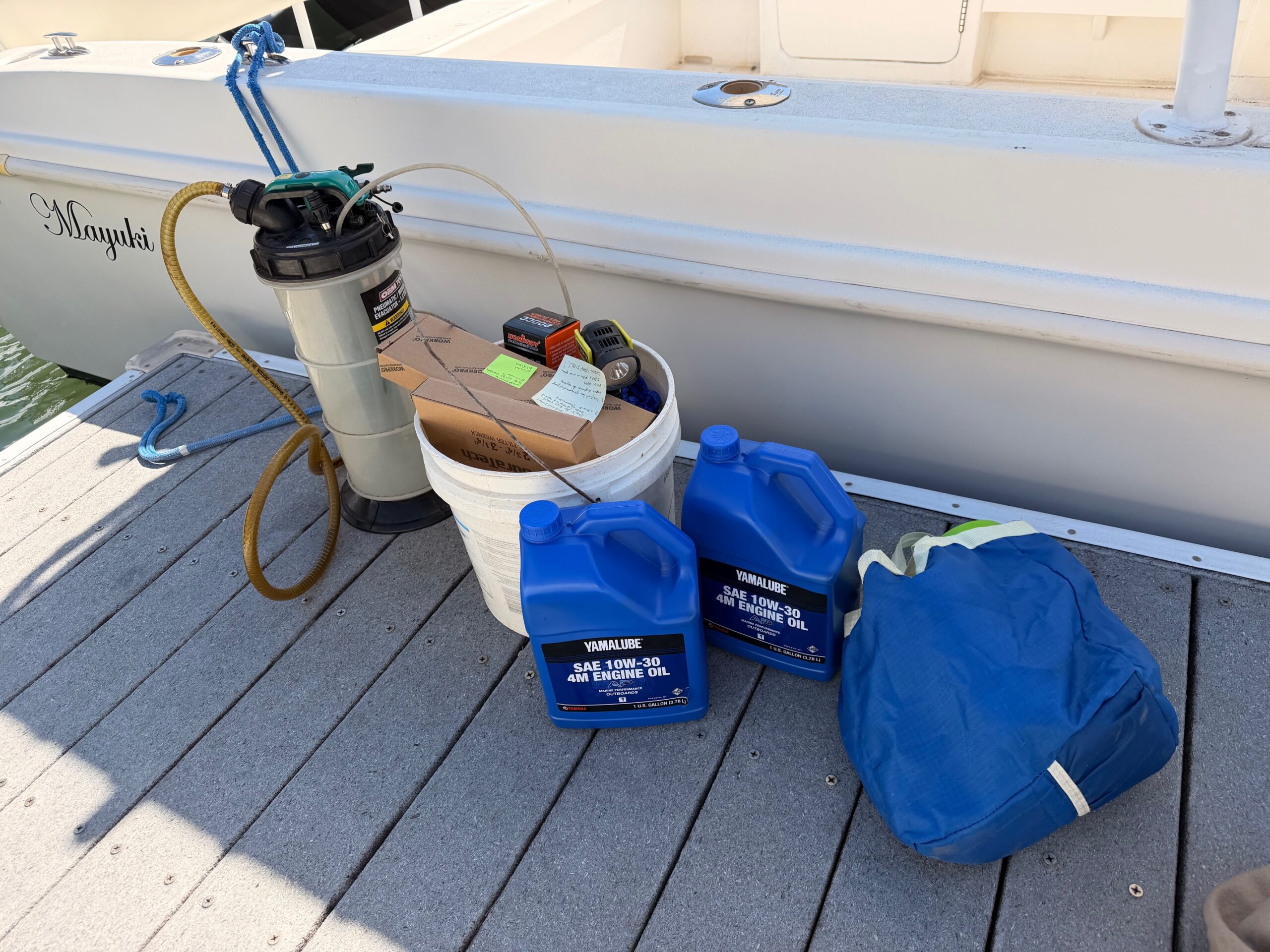 One thing I’ve never done before was to change the oil with the boat in the water. I didn’t even know it was possible until now. I’m going to change everything else too so I don’t have to pull her out of the water. I’m going to be the monkey mechanic swinging from the back of Mayuki.