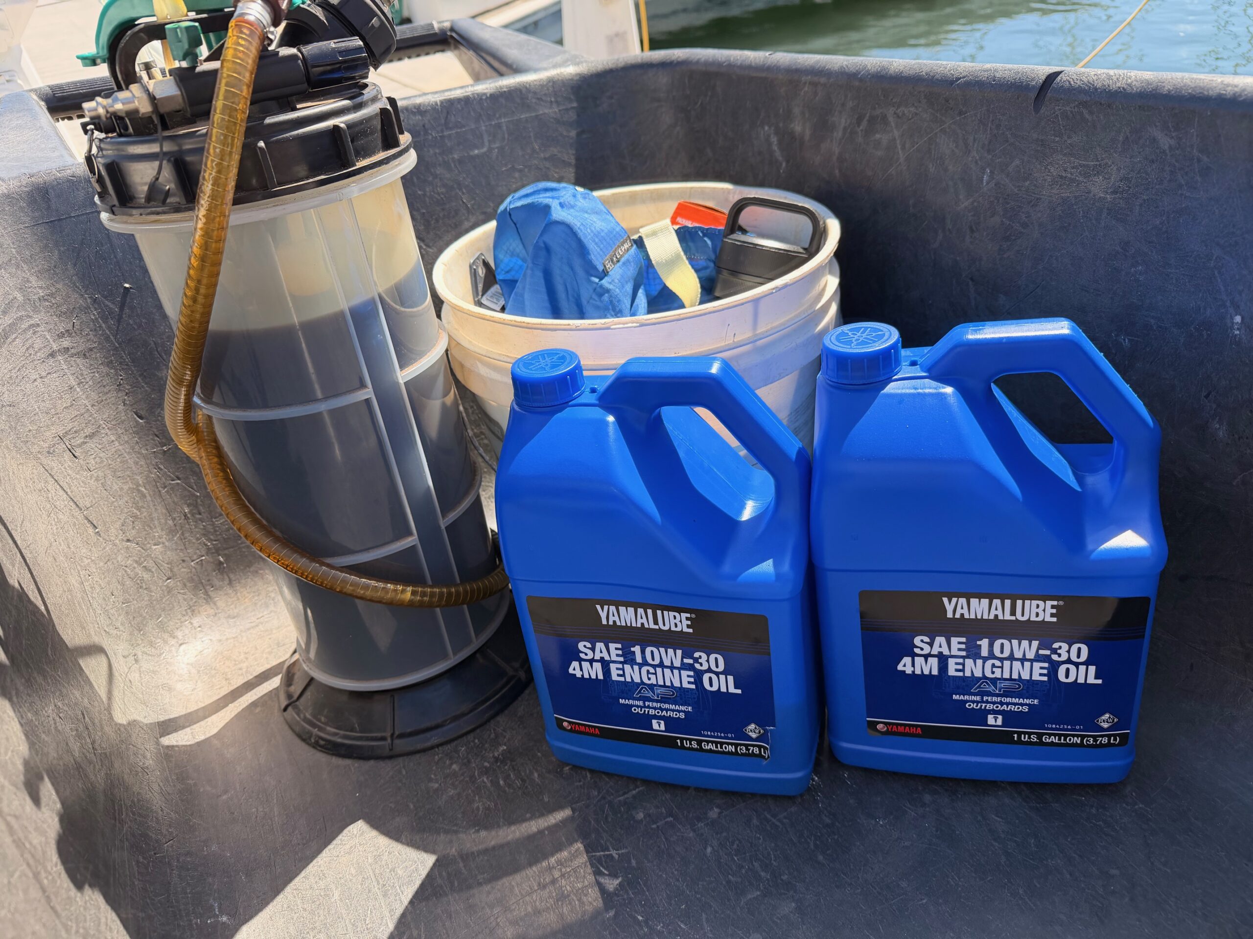 Each motor takes 4 quarts of oil and I pumped 5 quarts out. That meant 1 quart of gas was mixed into the oil. That’s not good at all. But according to Yamaha, that’s normal if you let your boat sit for long periods of time or don’t use it at full throttle. They say to put it in full throttle for 50 minutes periods. If I did that, I’d be on Molokai within an hour. Maybe I’ll try that next.