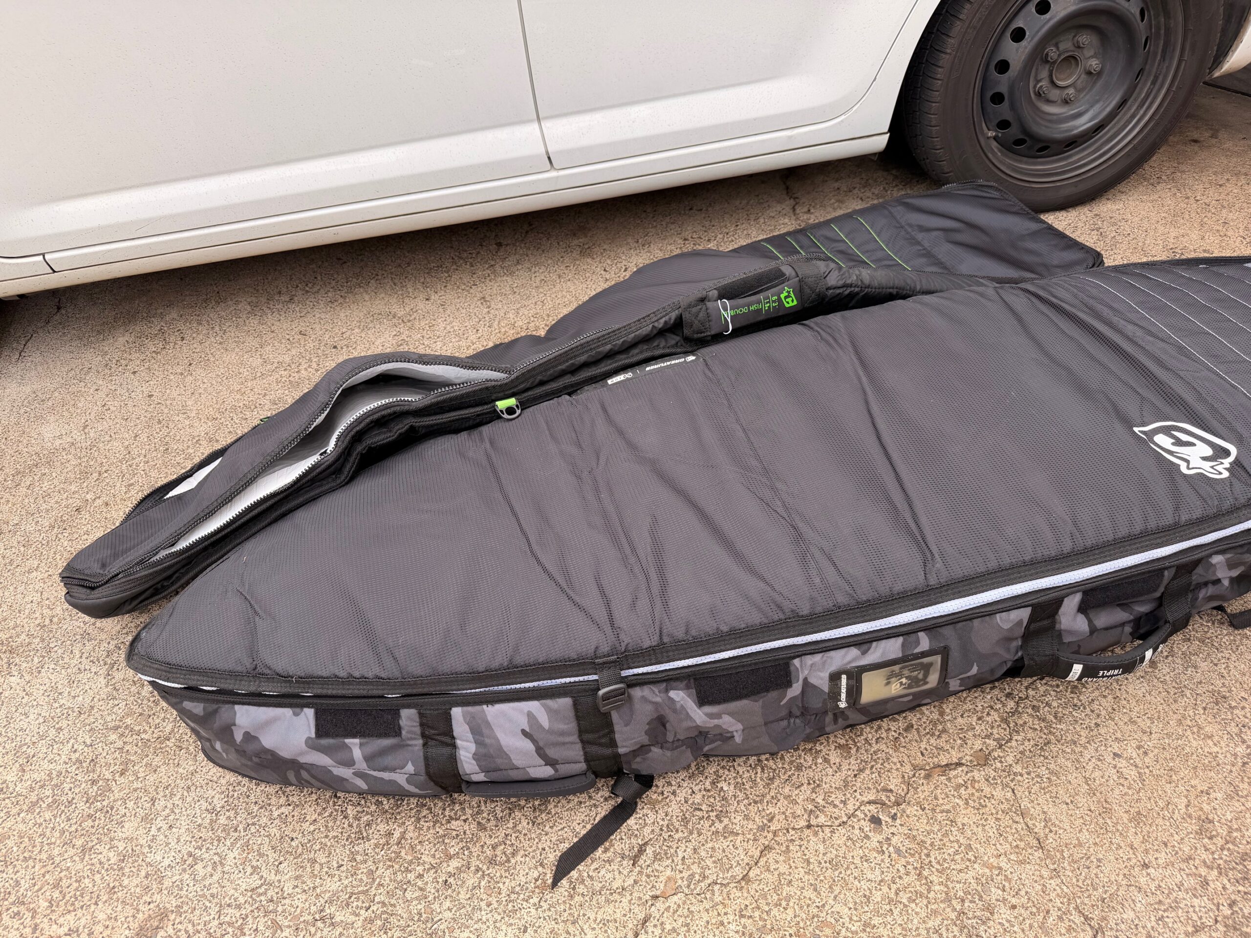 Round 1: Packing up for a surf trip. Boards, shorts, and wax is in. Ready!