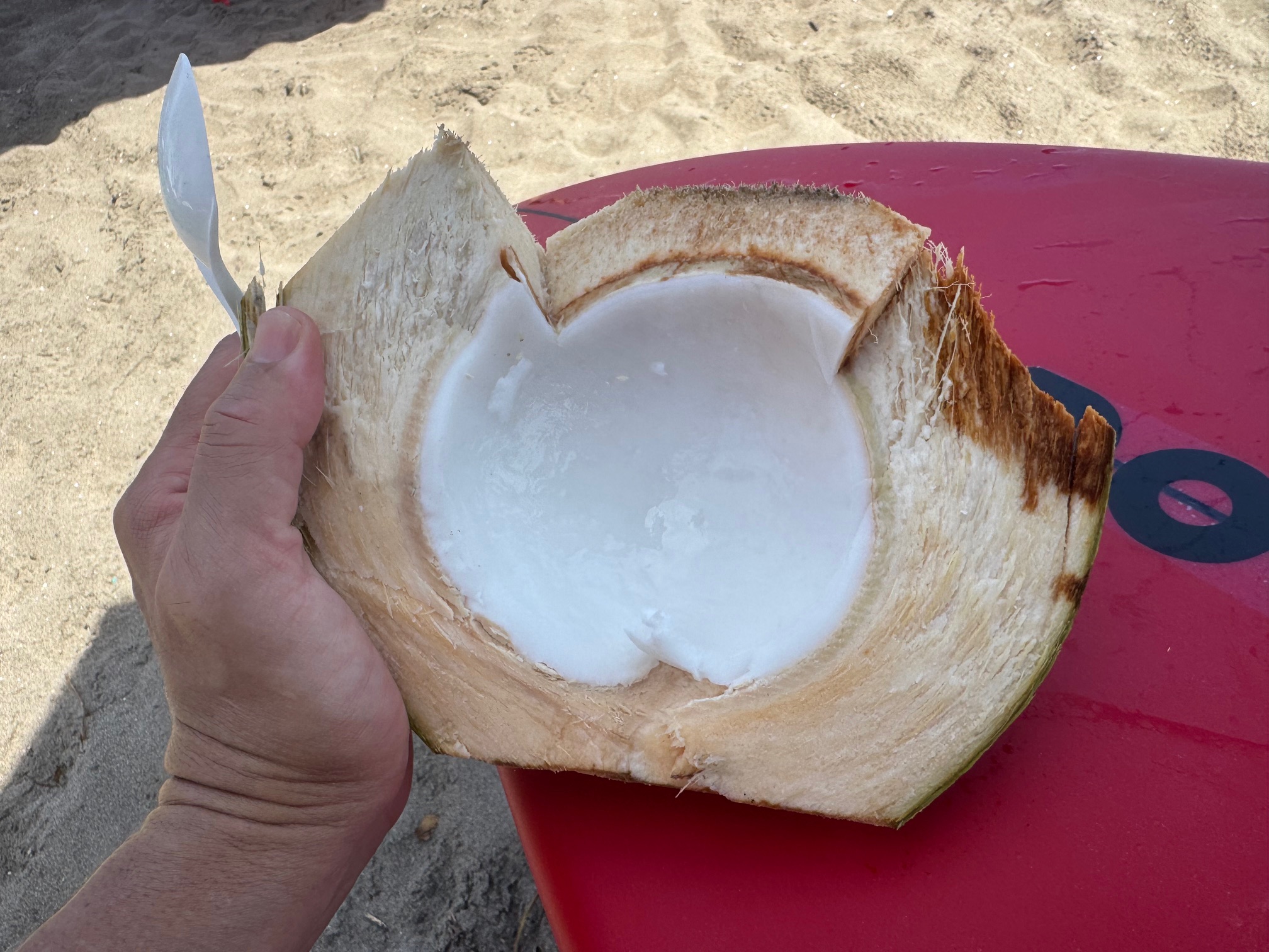 My advice is always to keep money in your surf trunks at all times. If I didn’t have this money, I wouldn’t have been able to buy this $1.50 coconut.